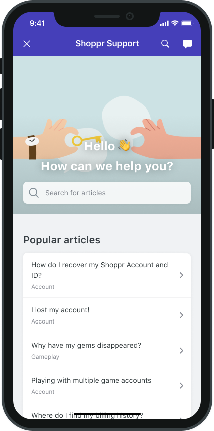This View Controller combines the FAQ, Search and Contact Us functionality together in a single interface. In this view, a user can search for a specific question in the FAQ failing which they can report an issue. When you respond back to their question from the Helpshift Agent Dashboard, the reply will be shown as a count besides Contact Us, clicking on which will open up the conversation.